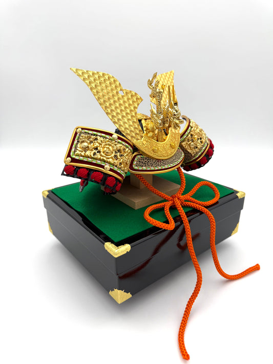 Japanese Ceramic Samurai Helmet Display (Kabuto) – Gold with Dragon & Tiger Screen