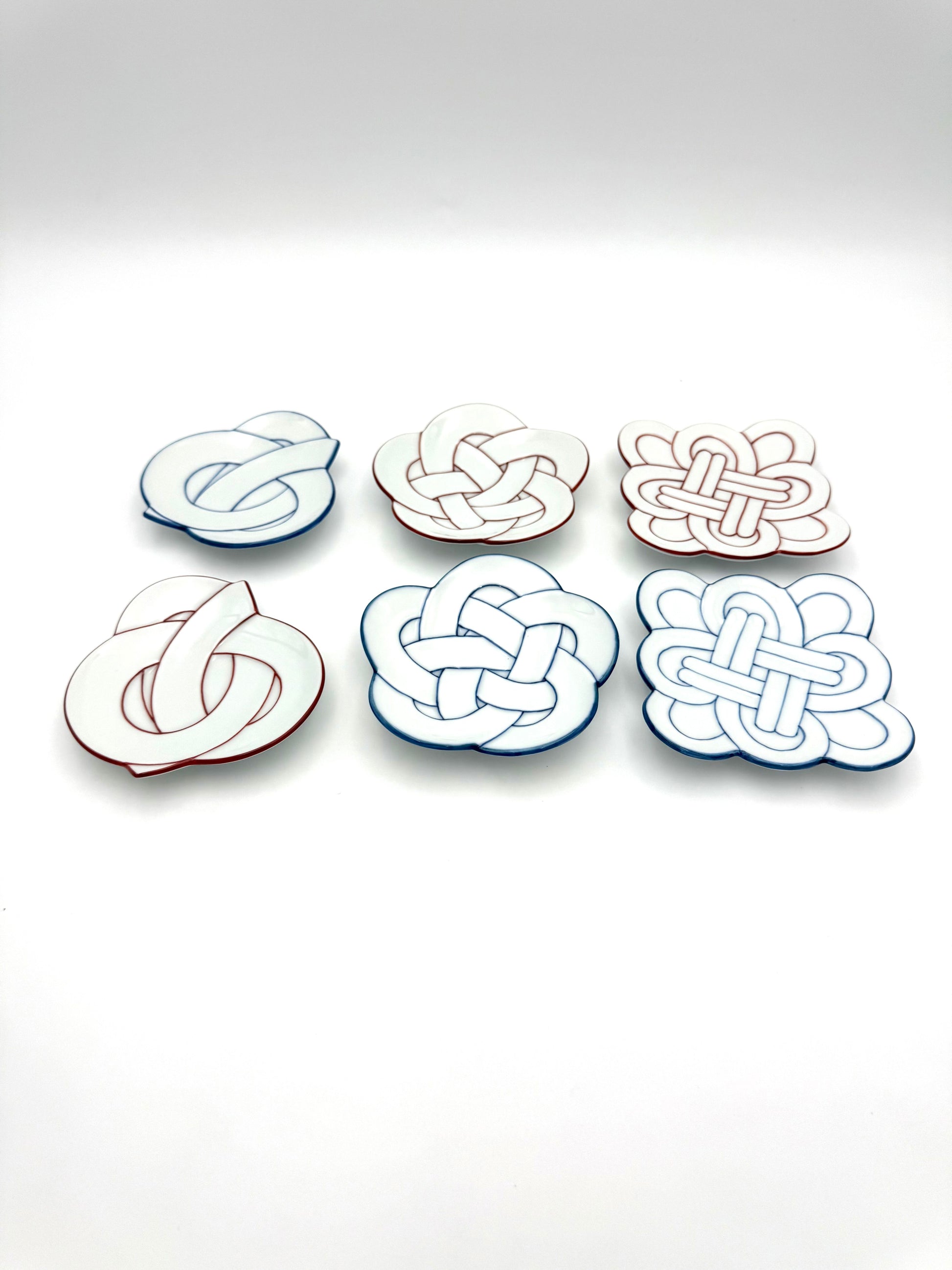 This exquisite six-piece Arita porcelain plate set beautifully showcases the artistry and symbolism of traditional Japanese decorative knots. Each plate features a different musubi motif—carefully crafted in elegant red-and-white and blue-and-white linework—creating a collection that is both visually captivating and rich in cultural meaning.