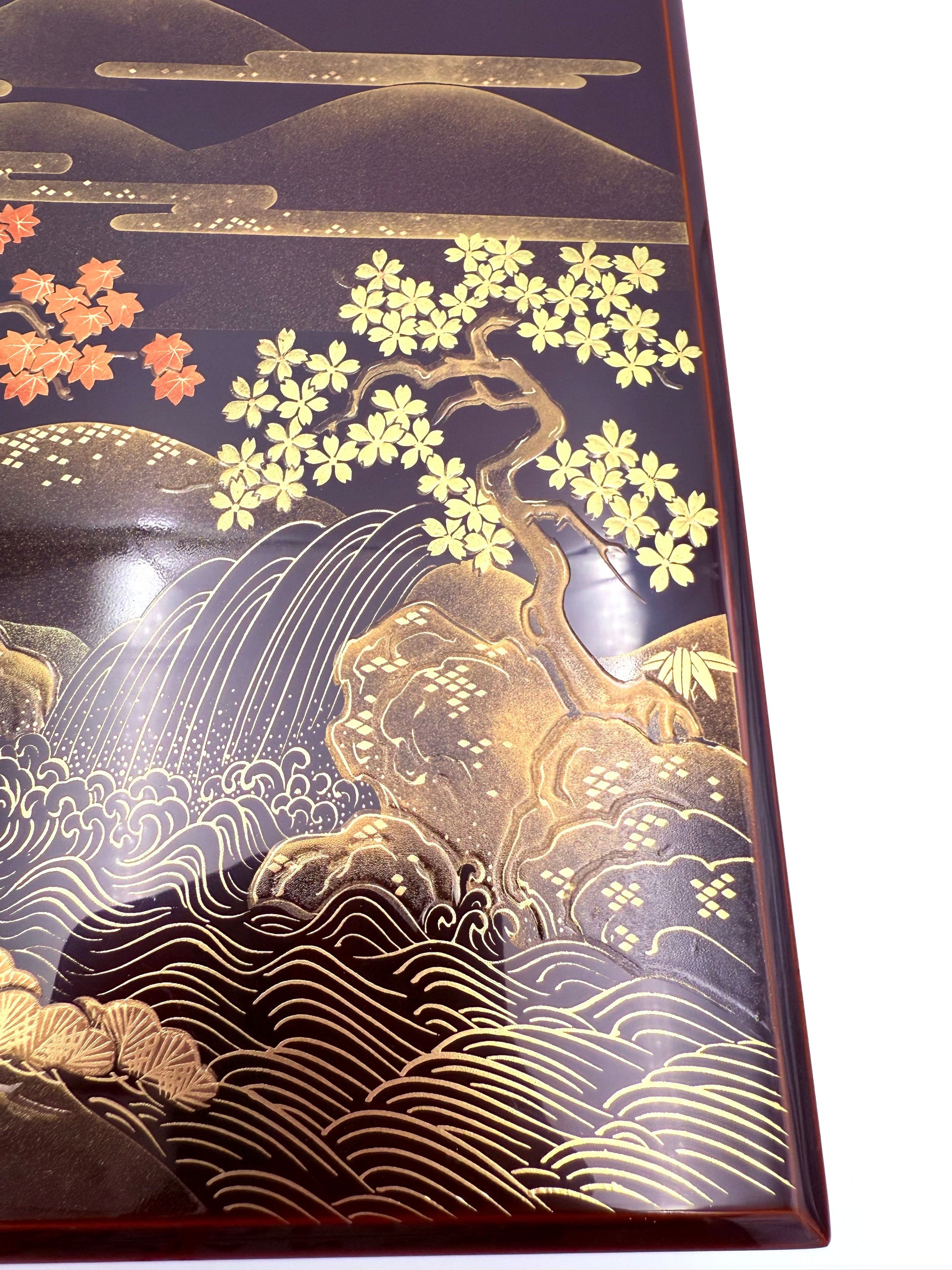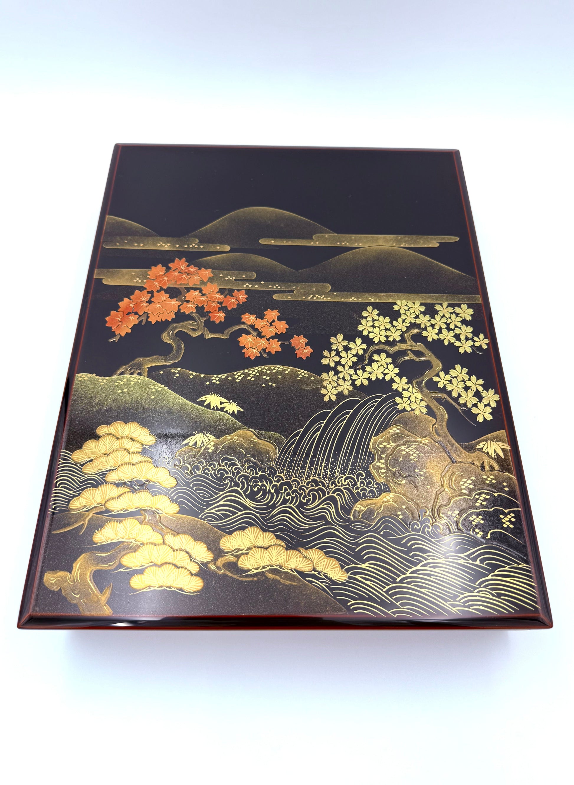 The design features a hand-painted maki-e landscape, delicately applied with gold and colored powders to depict mountains, flowing water, and seasonal motifs. Each line is drawn with precision, reflecting the depth and sophistication of traditional Japanese aesthetics.