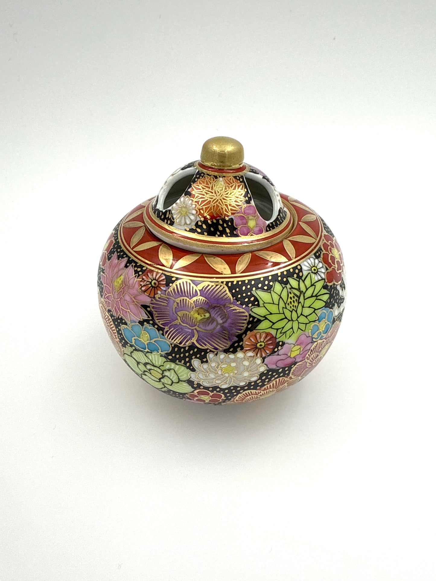 Kutani Yaki (Ware) Incense Burner, Floweres with Gold Edge, Black Background