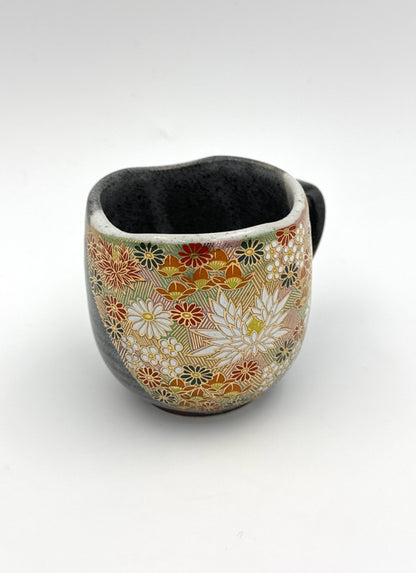 This Kutani-yaki mug showcases the stunning Kinkazume (Golden Floral Brocade) design, one of the most luxurious and iconic styles in Kutani ware. The surface is lavishly decorated with colorful flowers, each delicately outlined in gold to create a vibrant, kaleidoscopic effect. With every movement, the intricate patterns shimmer like a blooming garden.