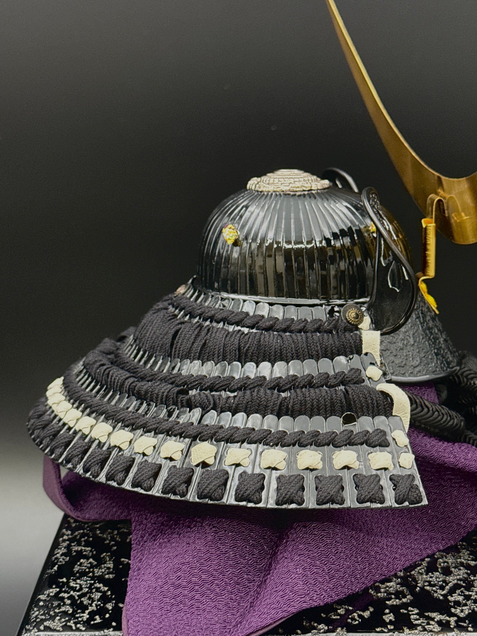 Produced using traditional armor-making techniques, the shikoro is carefully assembled by piercing lacquered plates and threading them together with black silk cords—a meticulous process that reflects the dedication of skilled artisans.